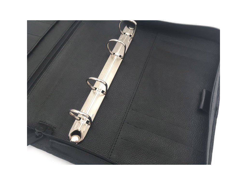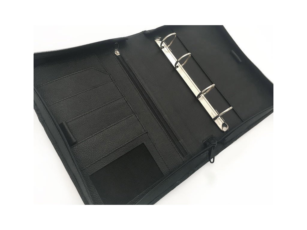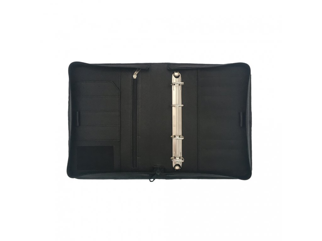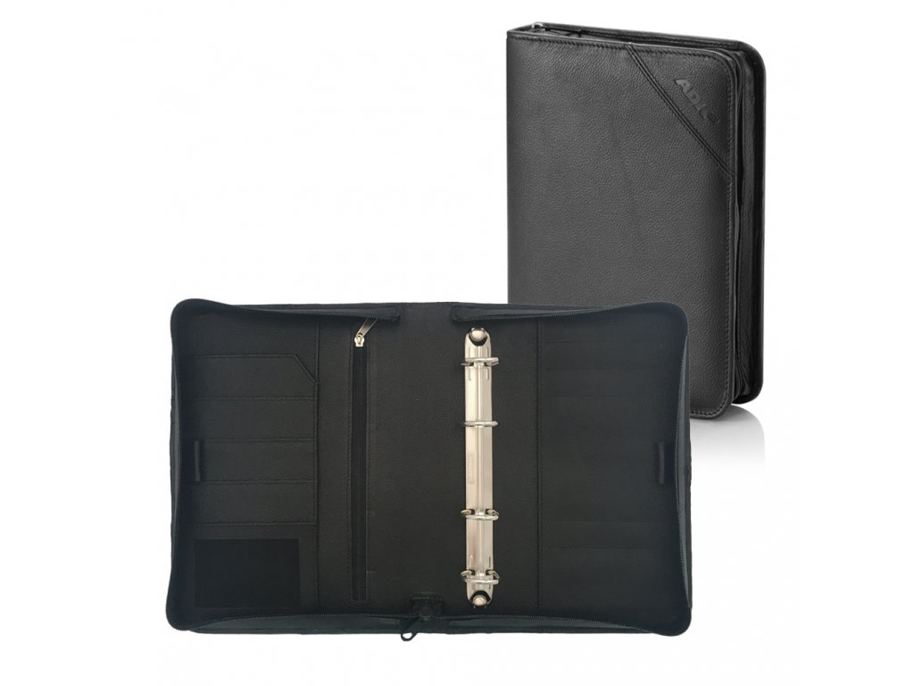 Samostatné kožené zipové desky formátu A5 s kroužkovou mechanikou ADK Diplomat v černé barvě.