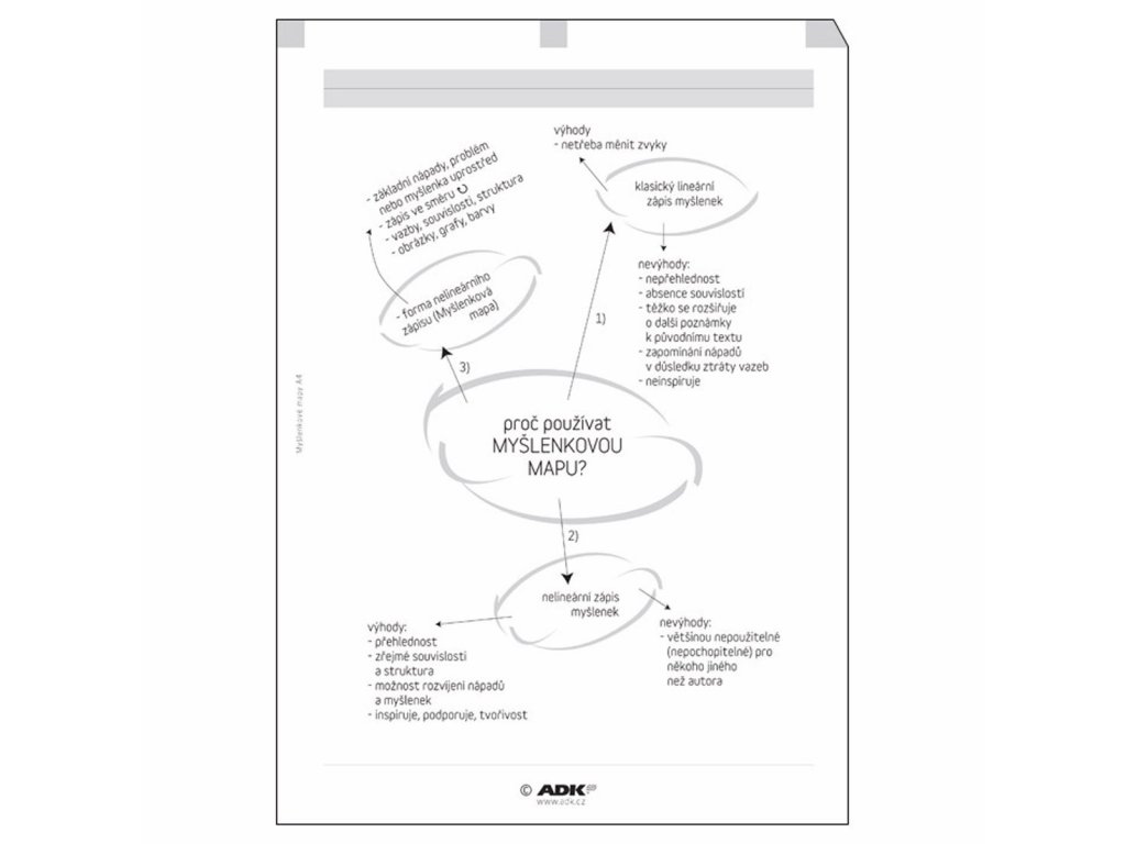 Myšlenkové mapy formátu A4 určené pro graficko-verbální, nelineární záznam Vašich myšlenek. Střed mapy slouží pro klíčový objekt, který je centrem naší pozornosti. Následně přidáváme hlavní témata, která s hlavním objektem přímo souvisí a pokračujeme dále vzdálenějšími motivy. Klíčové pojmy tvoří asociace a měly by nám jednoduše umožnit vybavit si celkovou informaci.