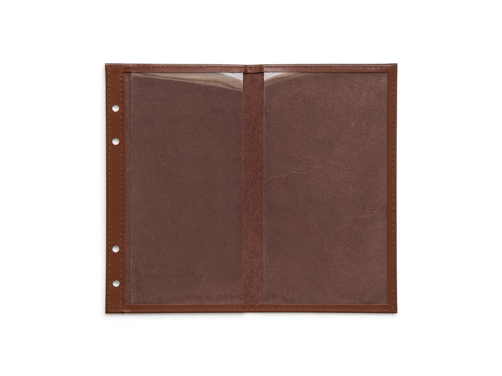 Hnedý kožený obal na mesačný diár, s dierovaním pre možnosť vloženia do krúžkovej mechaniky diárov ADK. Elegantná alternatíva namiesto štandardného obalu z číreho plastu.
